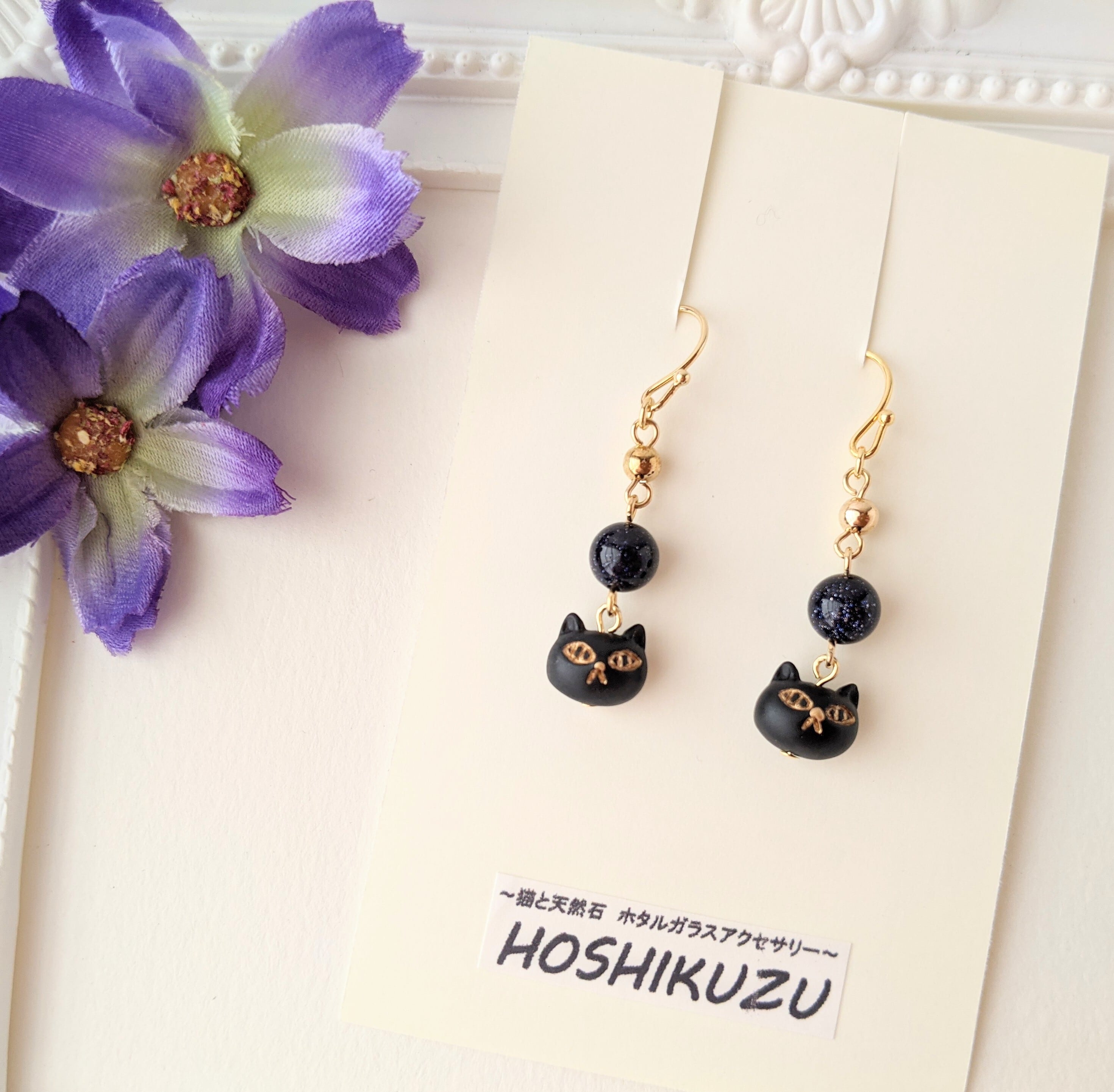 おすまし顔がかわいい♡黒猫と優しくきらめくブルーサンドストーンのイヤリング・ピアス