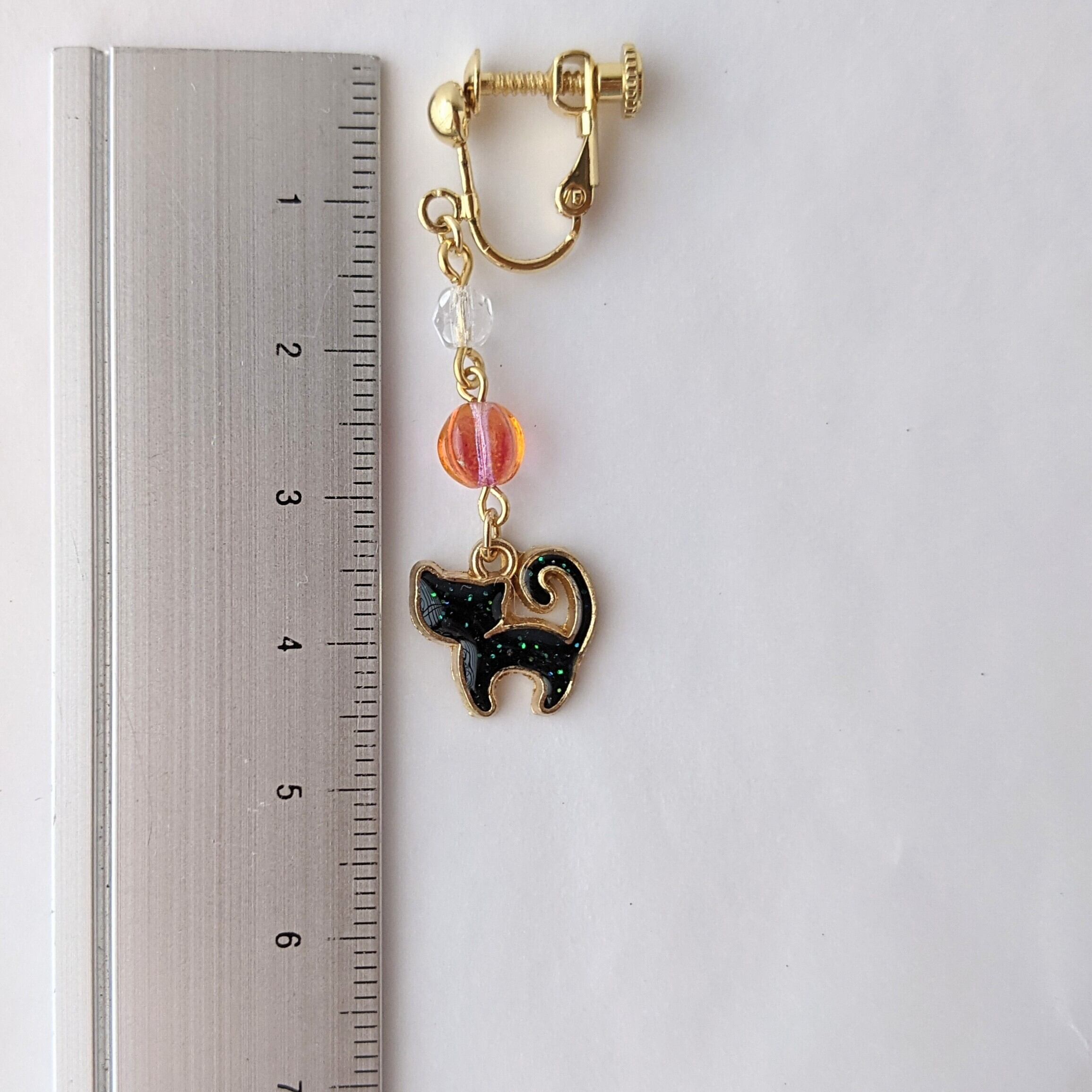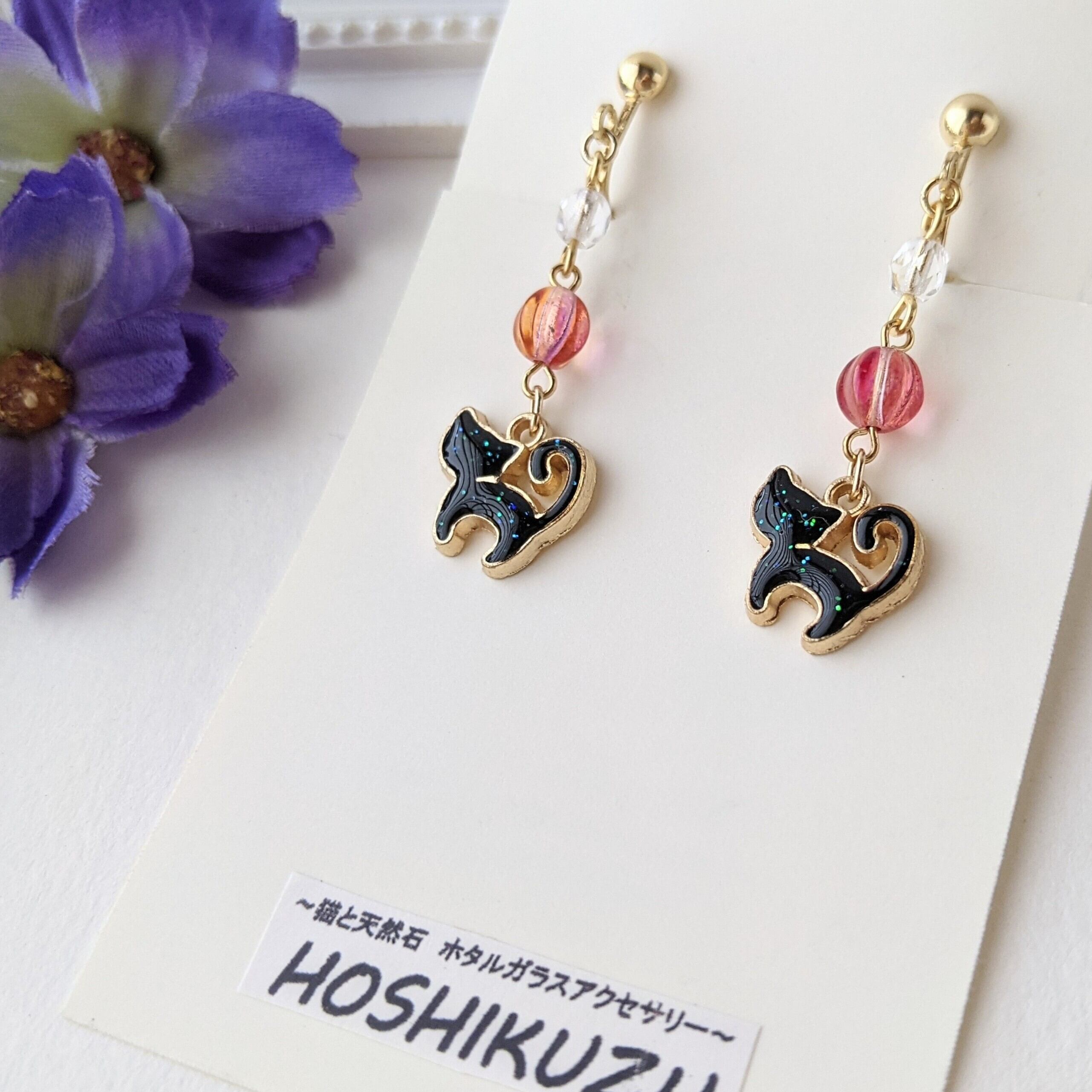 キラキラ輝くラメ入り黒猫のイヤリング·ピアス(フューシャオレンジ)
