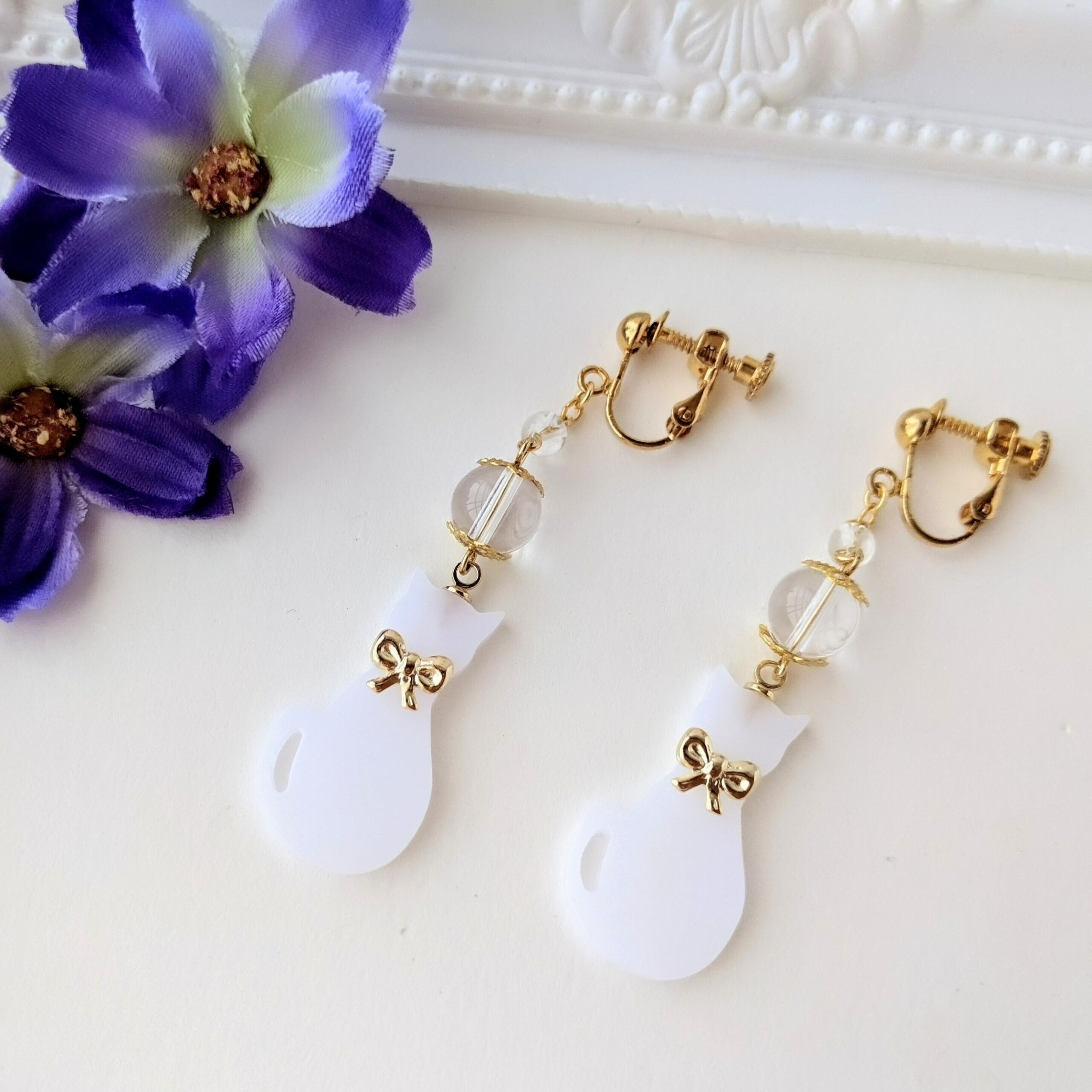 ~水晶の透明感が美しい白猫のイヤリング・ピアス~