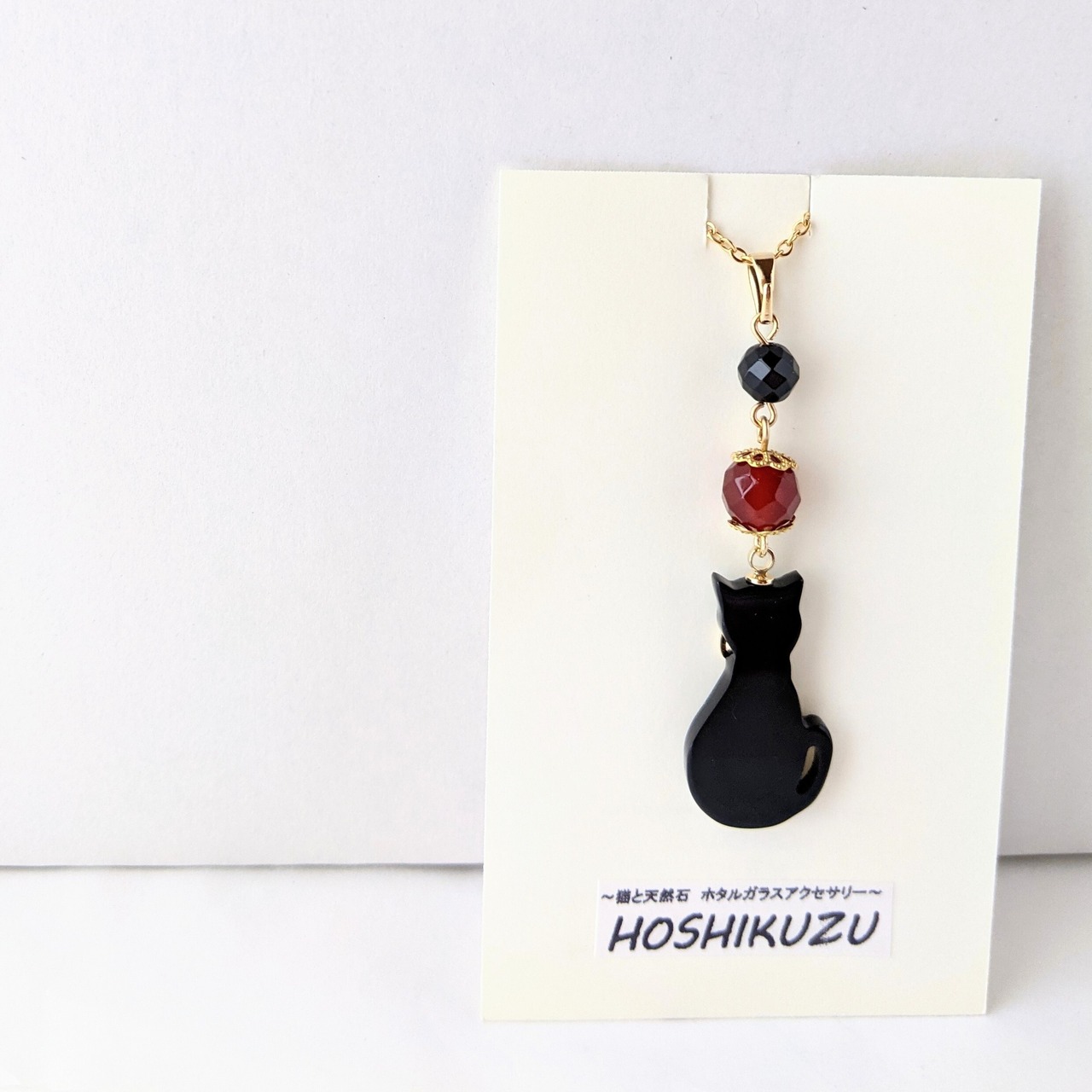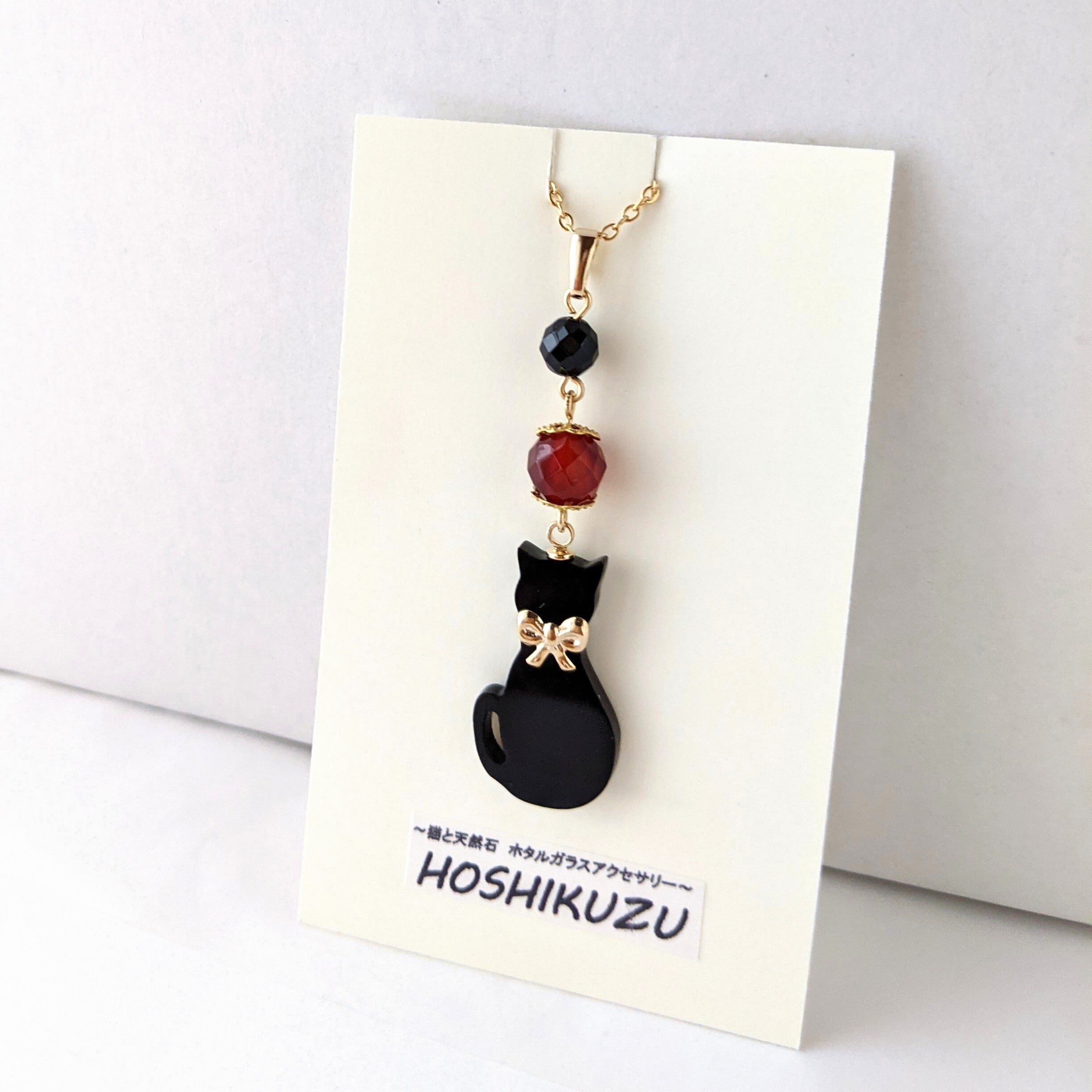 ~リボンを着けた可愛い黒猫と落ち着いた色合いの天然石ネックレス~