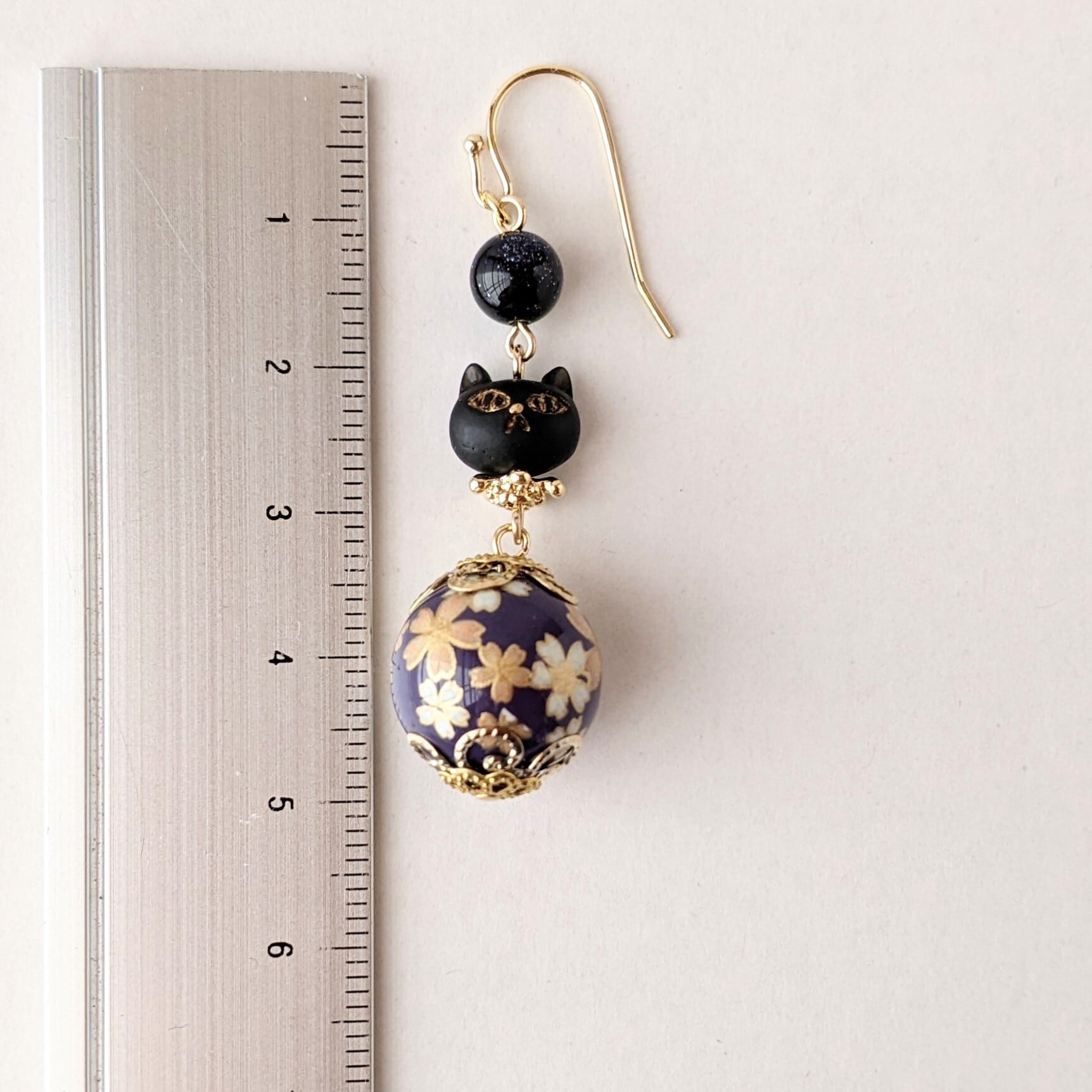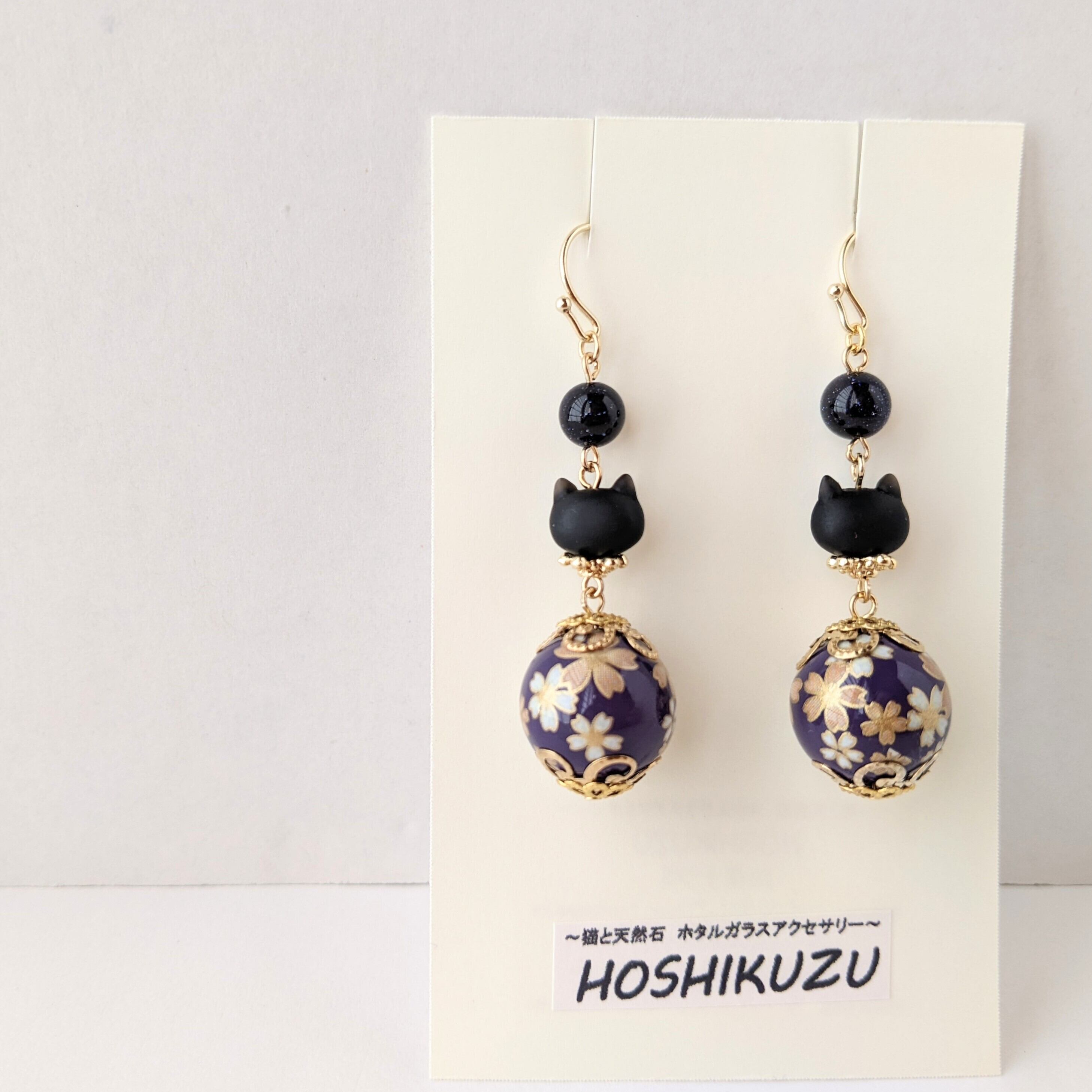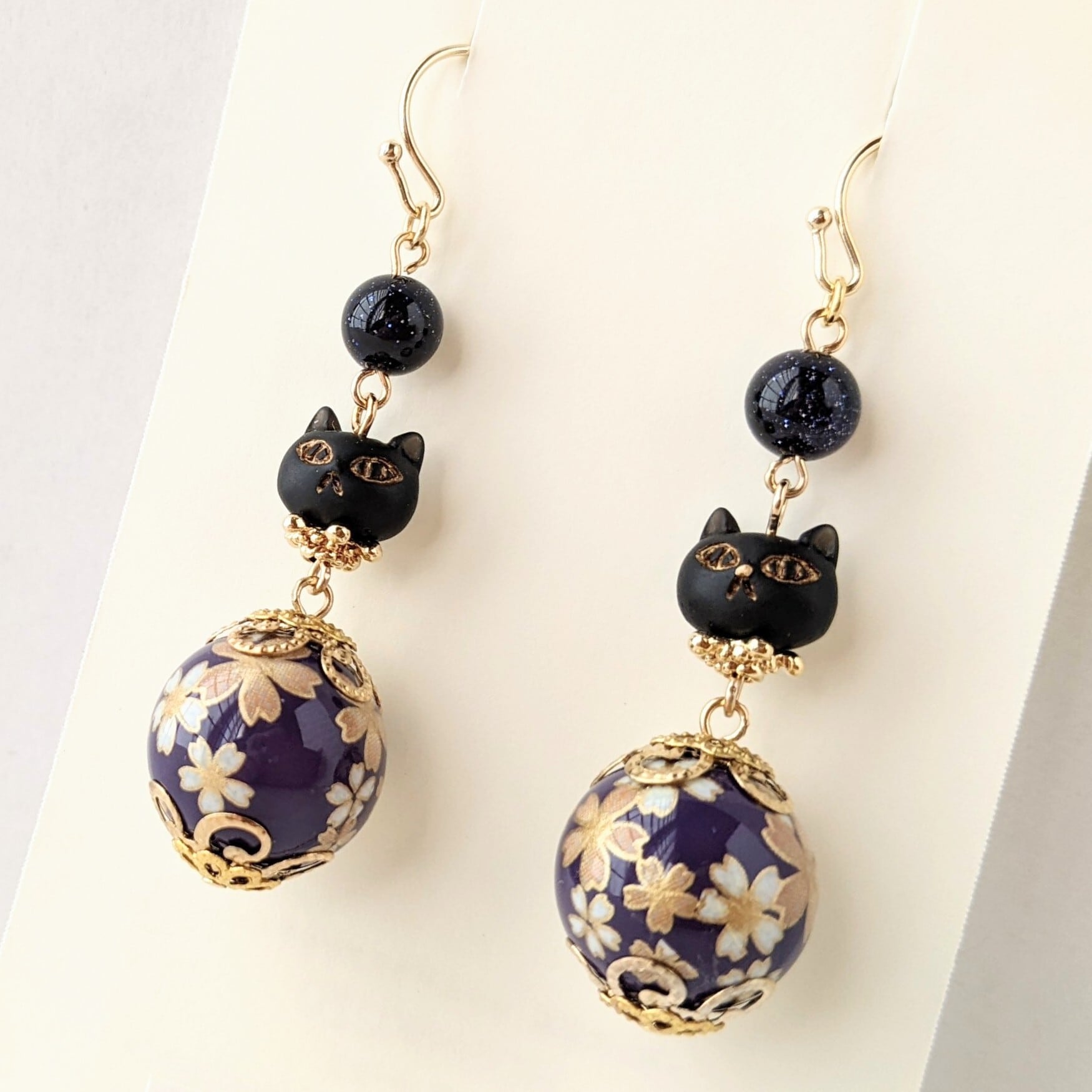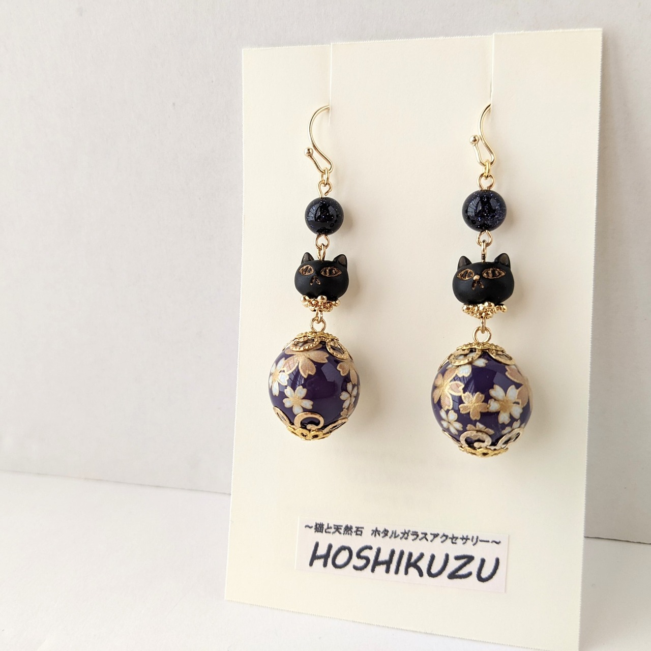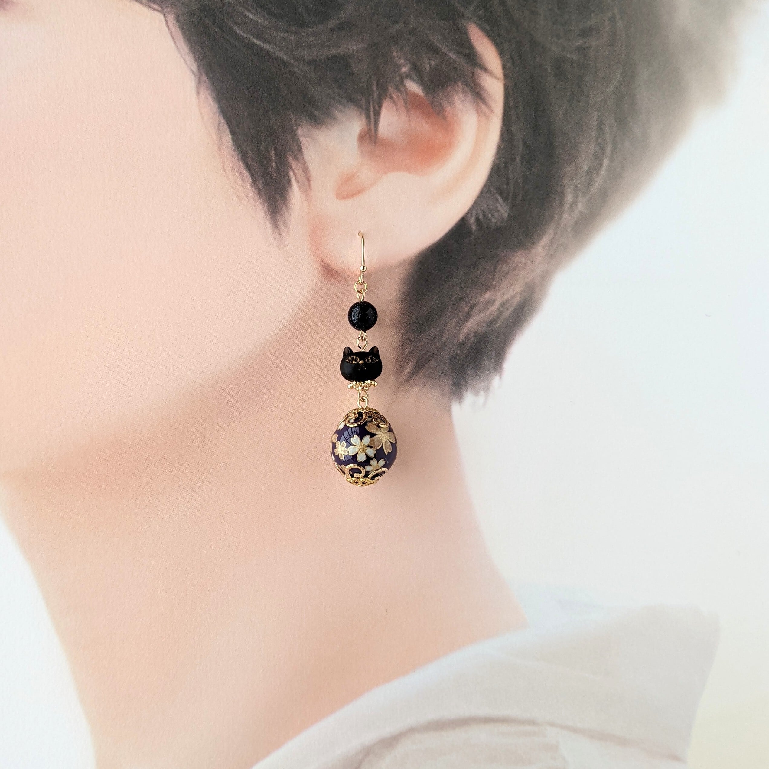 おめかし猫と一緒におでかけ♪耳元から桜咲く 猫とブルーサンドストーンの夜桜イヤリング・ピアス