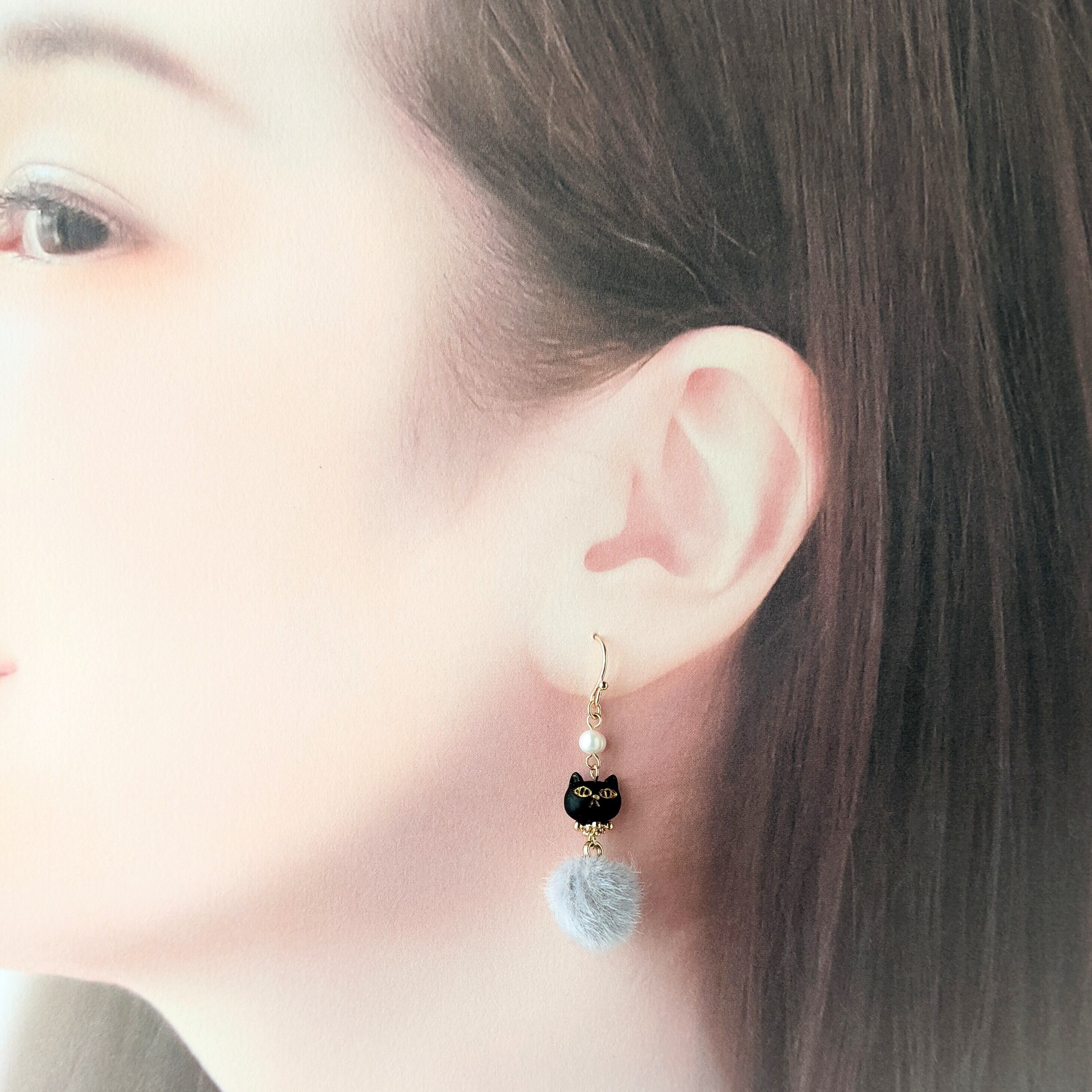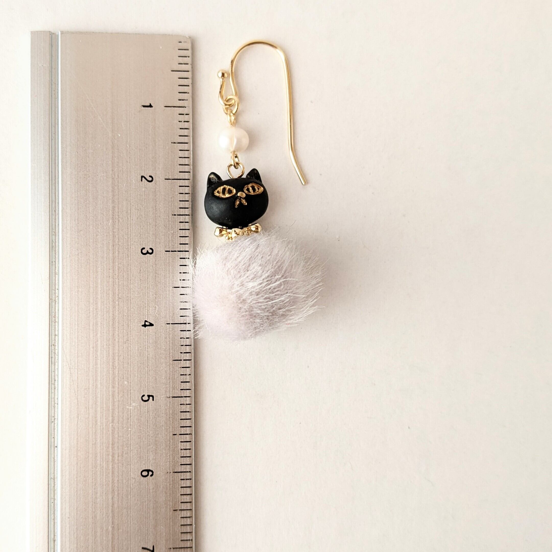 おめかし猫と淡水パールのファーイヤリング・ピアス(黒)