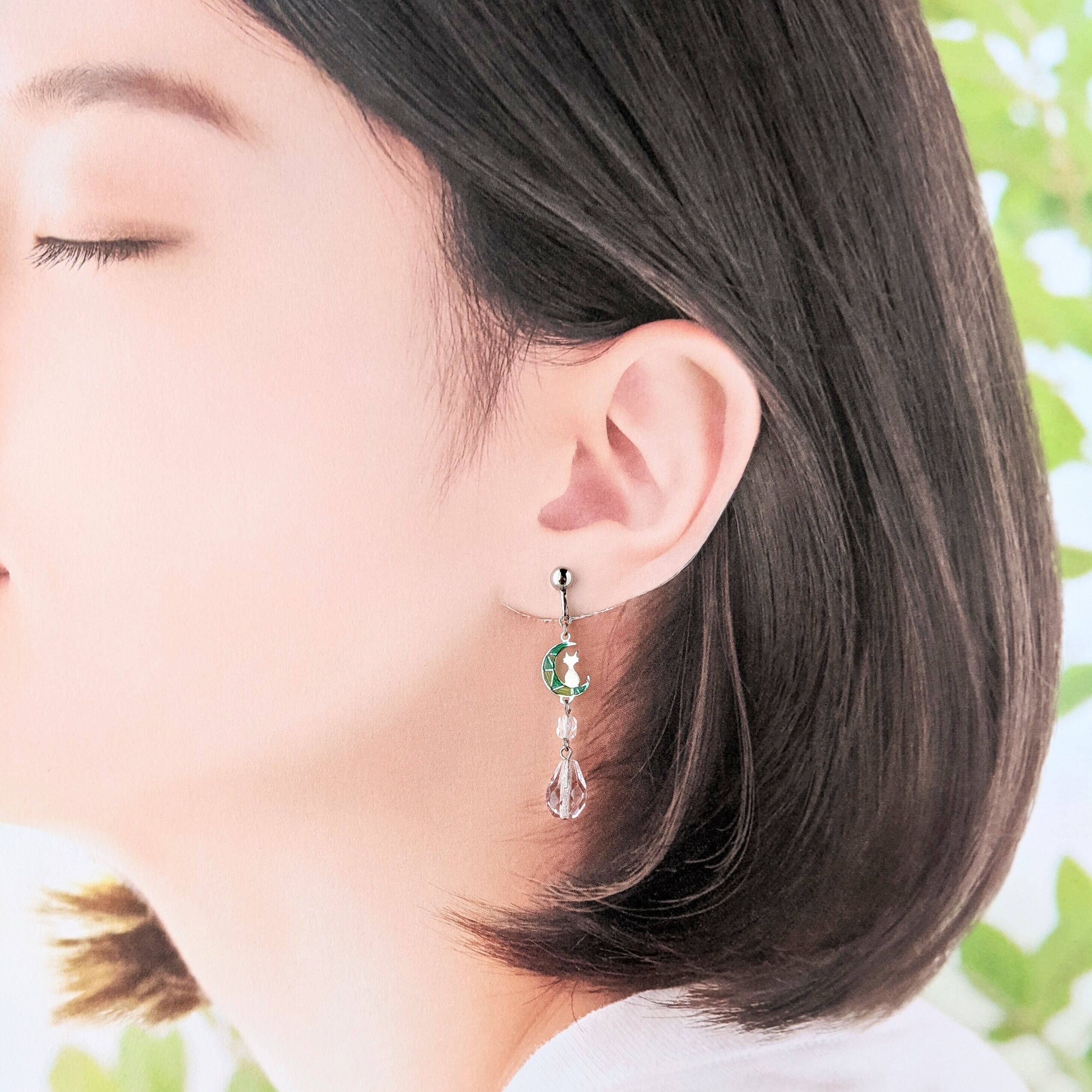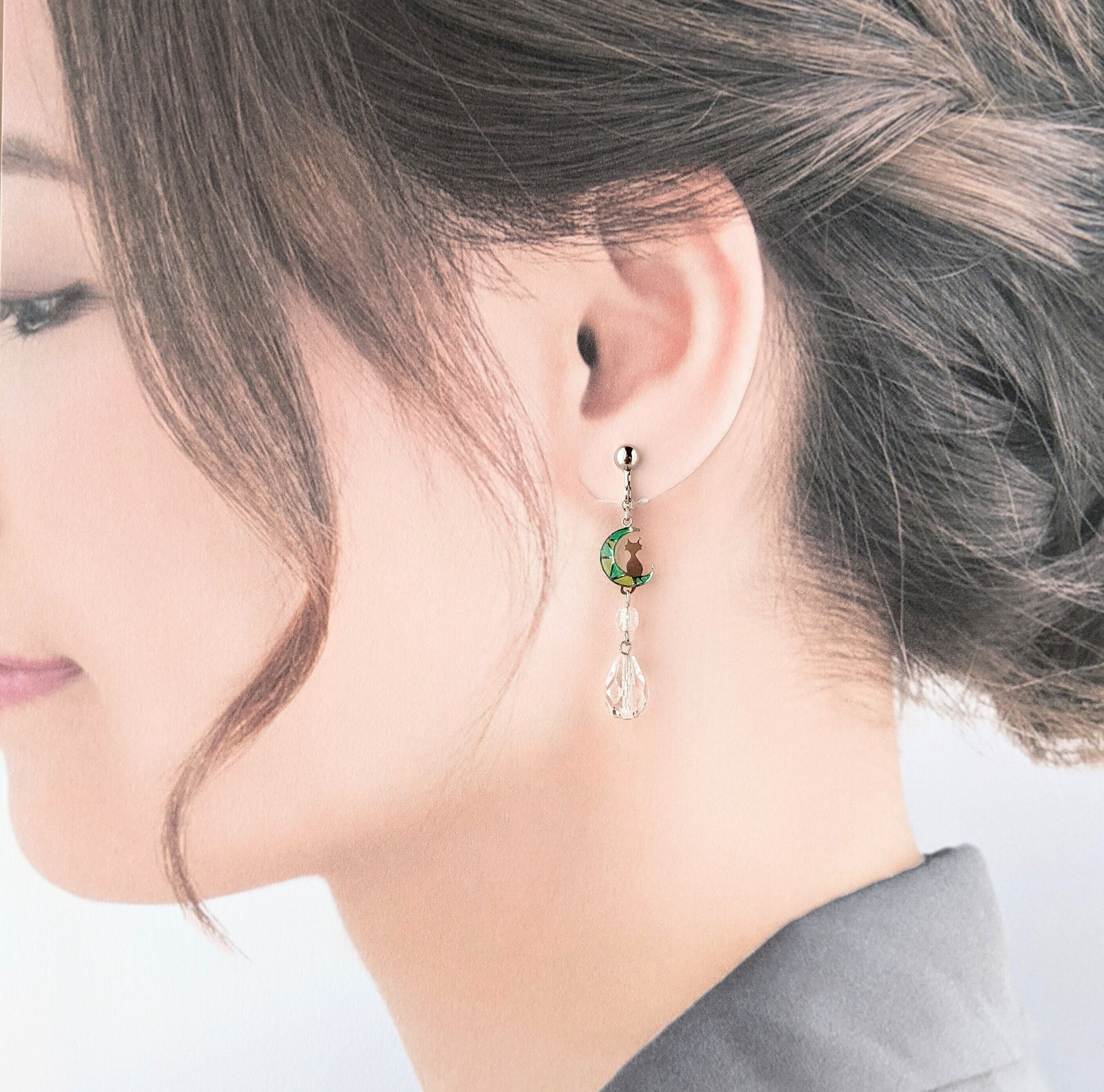 ステンドグラス風☆猫と月のしずくイヤリング·ピアス(緑×黄緑)