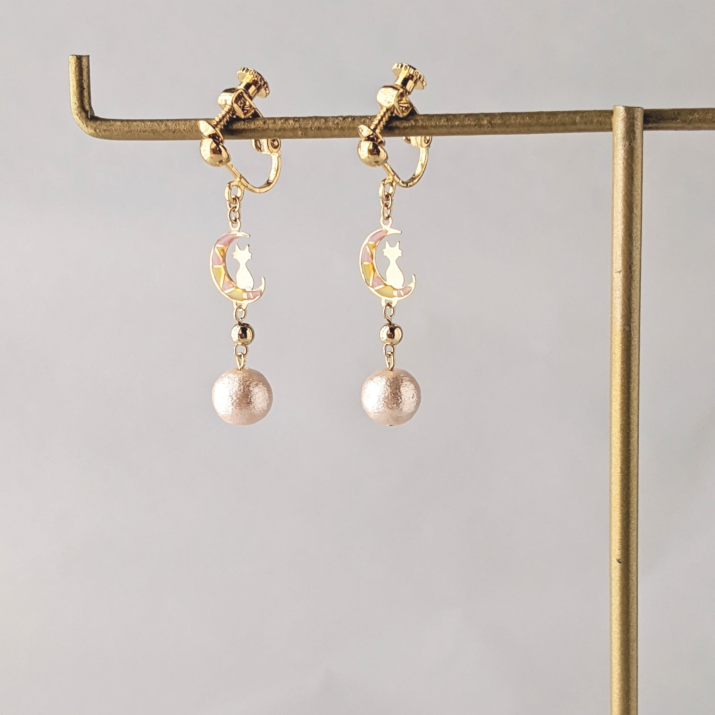 ステンドグラス風☆猫と月のコットンパールイヤリング·ピアス(ピンク×黄色)