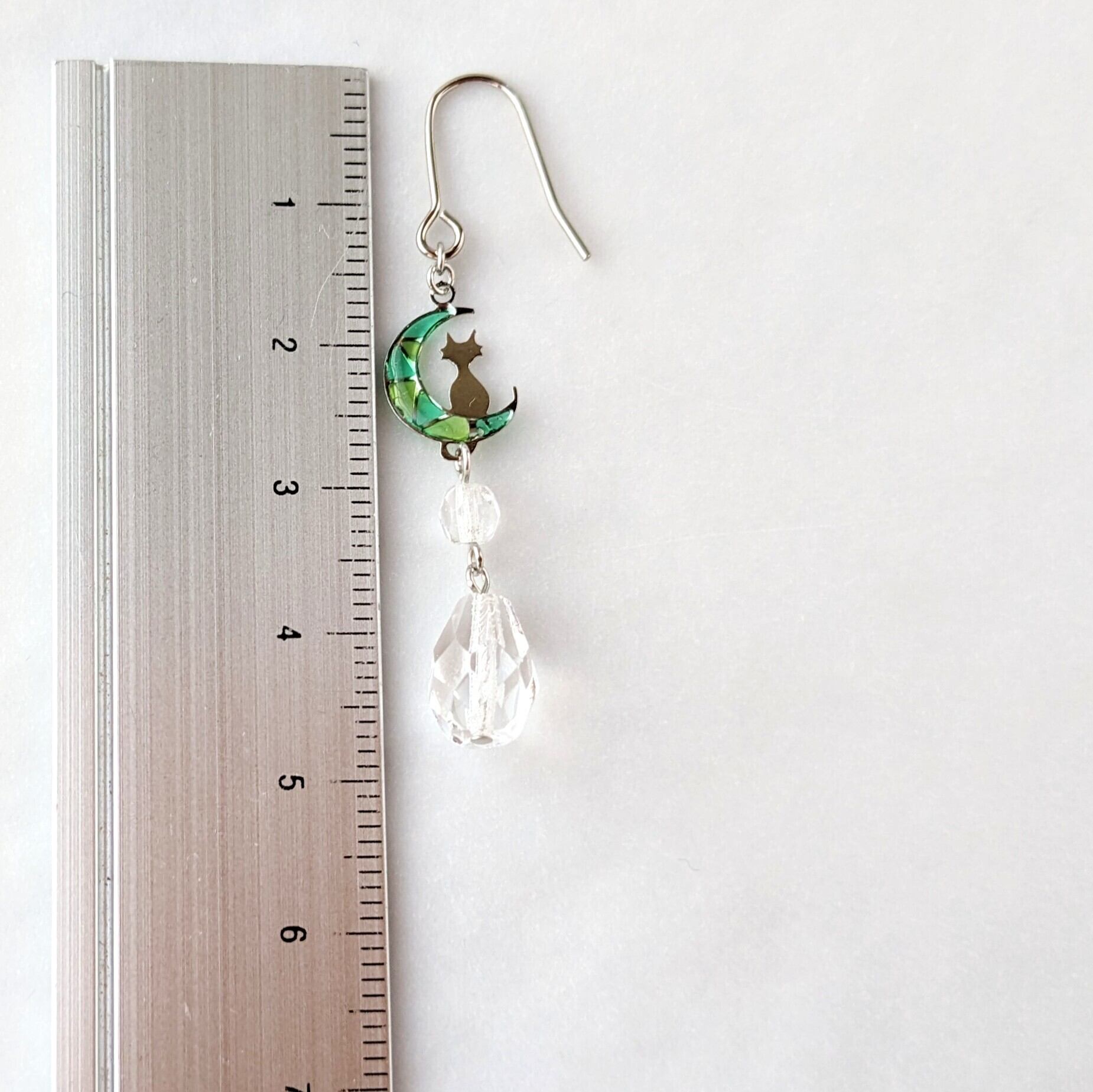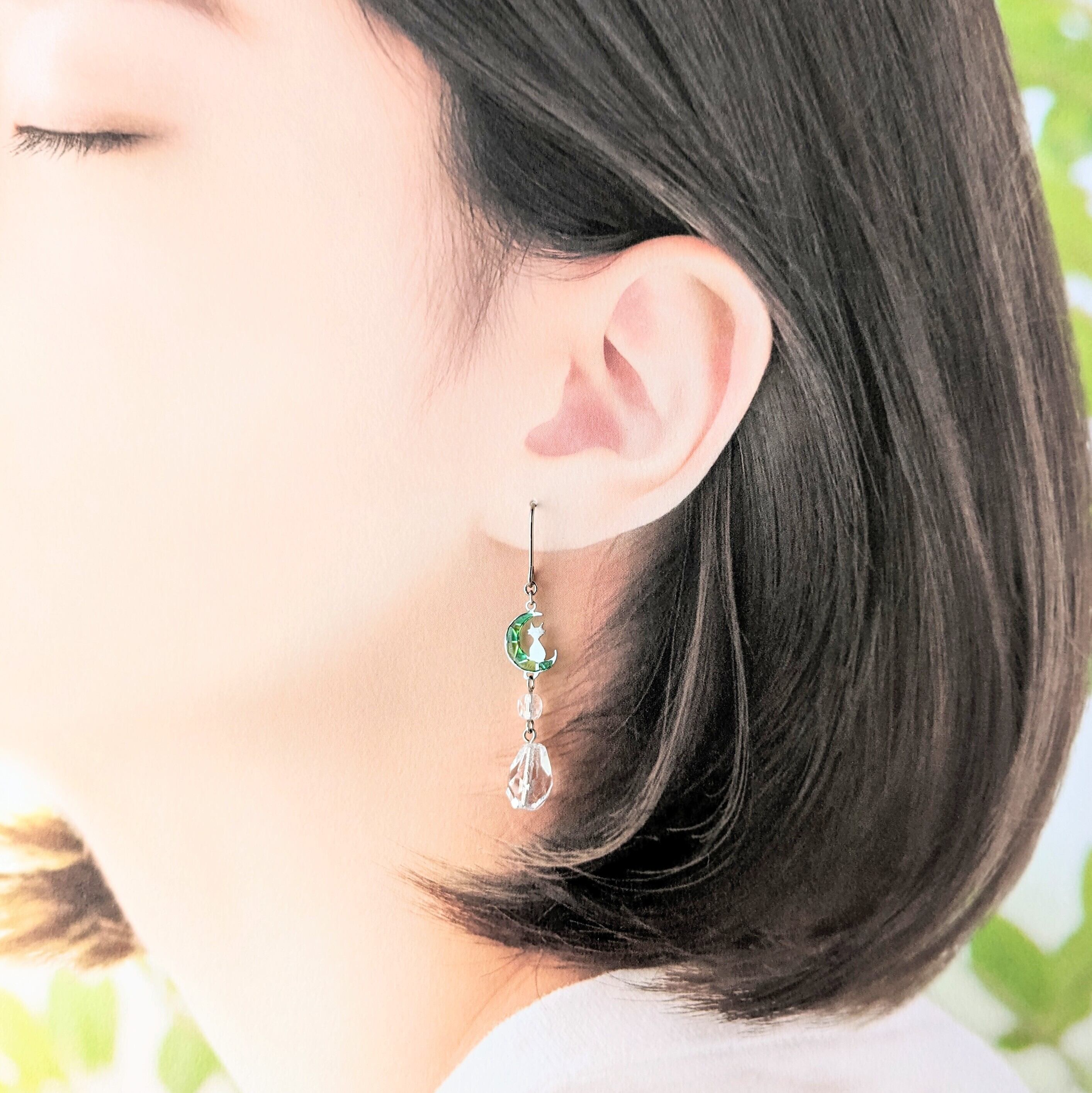 ステンドグラス風☆猫と月のしずくイヤリング·ピアス(緑×黄緑)